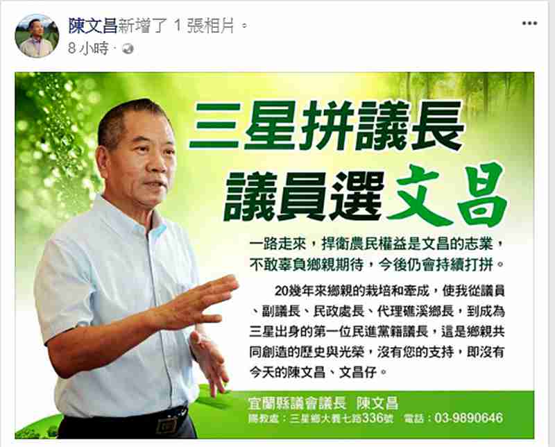 20幾年來鄉親的栽培和牽成,使我從議員、副議長、民政處長、代理礁溪鄉長,到成為三星出身的第一位民進黨籍議長,這是鄉親共同創造的歷史與光榮,沒有您的支持,即沒有今天的陳文昌、文昌仔。