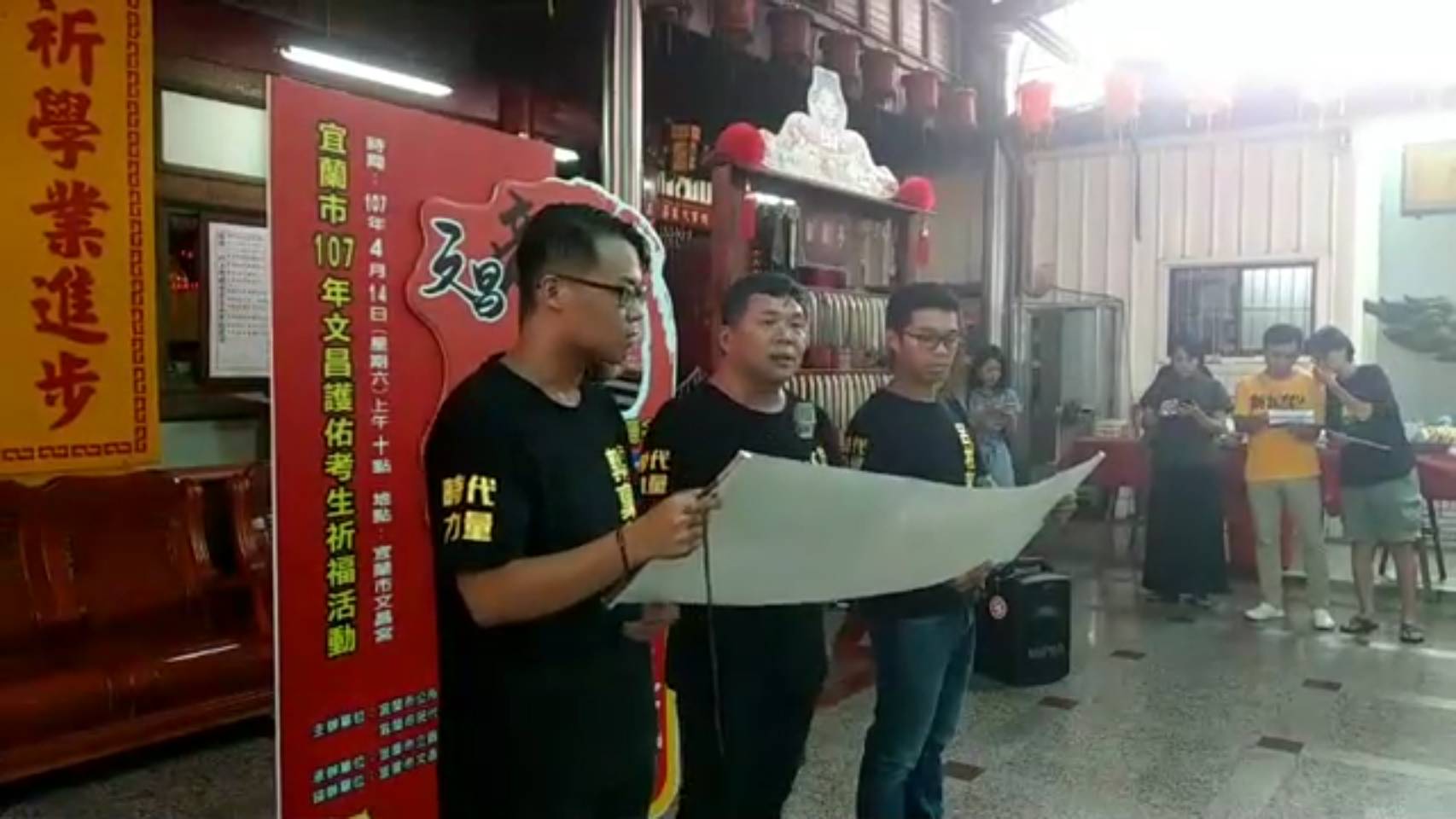 時代力量宜蘭縣議員參選人林正芳(中)、宜蘭市民代表第一選區參選人郭禀翰(左)、宜蘭市民代表第四選區參選人呂柏凱就到文昌宮宣布登記參選。(照片/邱淑珍擷取)