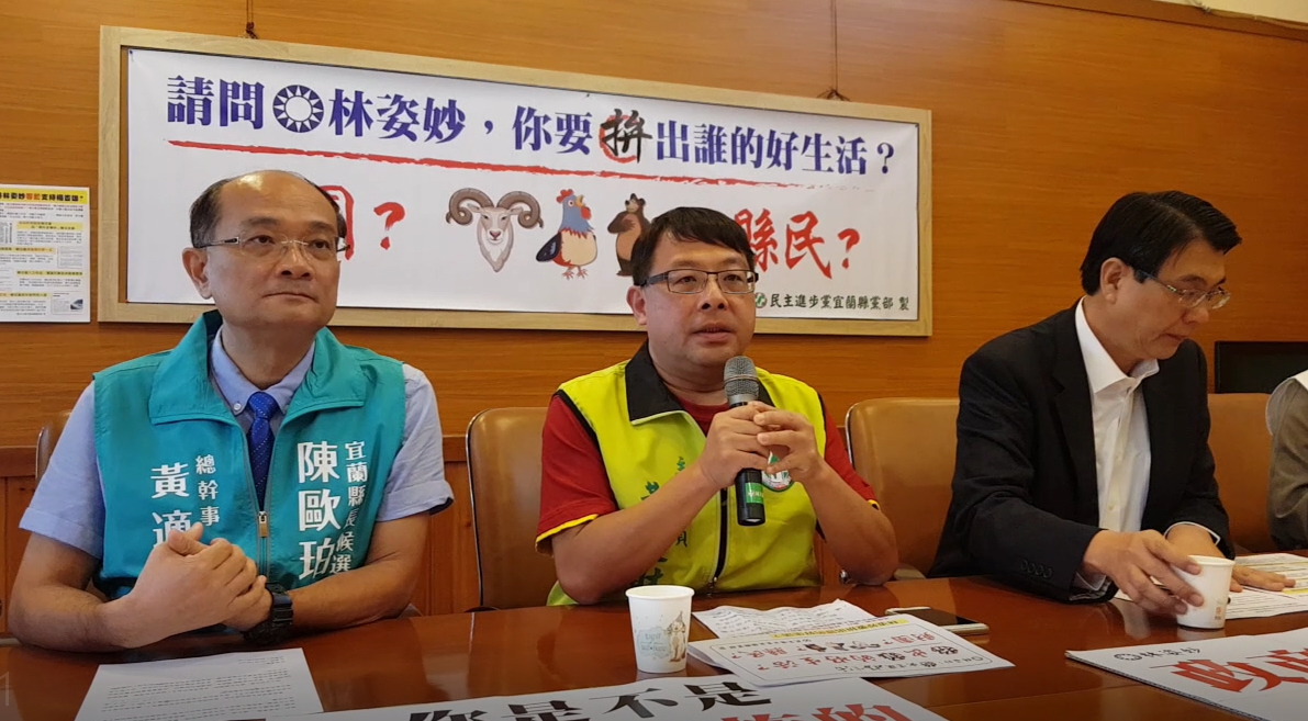 民進黨宜蘭縣黨部前後三位主委,今(17)日聯手召開「三問楊吉雄」記者 會,猛攻國民黨縣長候選人林姿妙,質疑楊吉雄是幕後操盤手、幕後金主、地下縣長,並懸掛大型看板──林姿妙拚出宜蘭好生活.拚出誰的好生活?.財團?羊雞熊(以圖片諧喻楊吉雄)?縣民?。