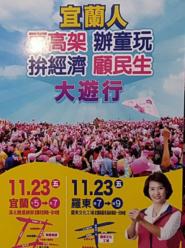 【記者林周龍/宜蘭報導】距離投票日只剩2天,藍綠候選人莫不使出渾身解數展開最後衝刺,國民黨宜蘭縣長候選人林姿妙溪南競選總部今(22)日舉辦邀請前行政院長張善政參加選前最後1次造勢晚會外,明天下午分別在宜蘭,羅東2起舉辦「宜蘭人要高架,辦童玩,拚經濟,願民生」改變宜蘭大遊行,邀請蘭陽鄉親一起上街遊行。
