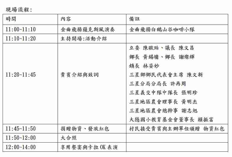 据了解,豪圓實業公司照顧低收入戶的方式,是採持續性的,之前款待過的村里,以後每個月會持續接待,同時擴增新的村里。公司秉持的是人飢己飢的精神來溫暖,從三星鄉開始,逐步溫暖宜蘭縣的鄉親們。