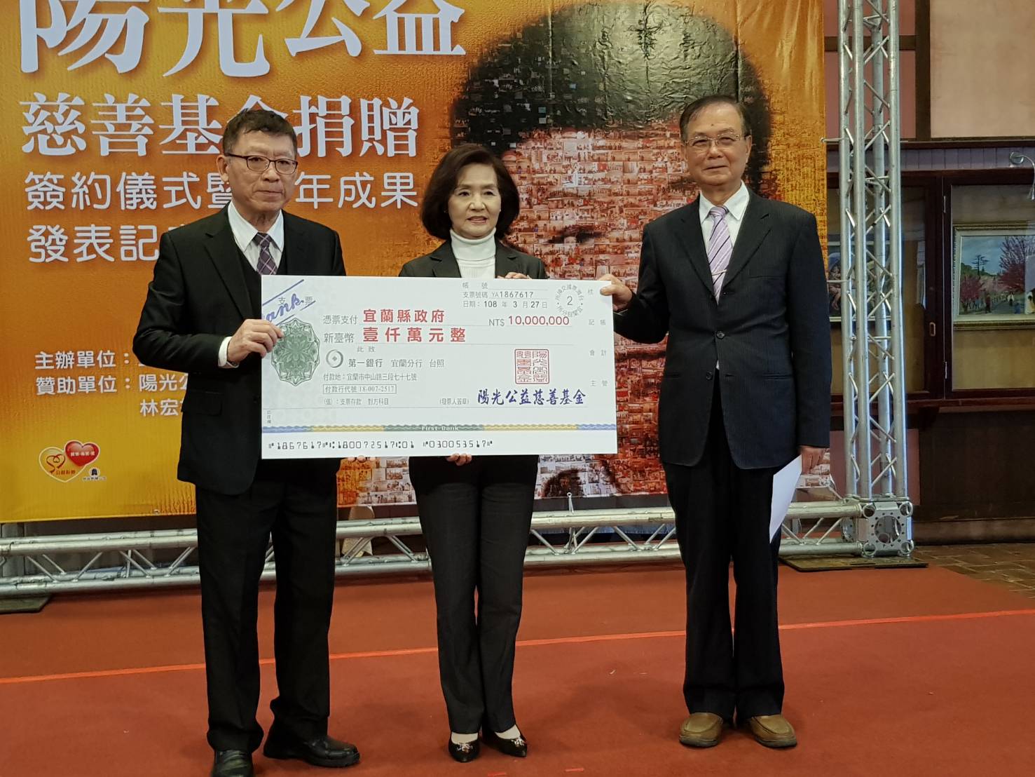 陽光公益慈善基金會林宏裕教授捐贈1000萬支票給宜蘭縣政府。(記者邱淑珍/攝影)