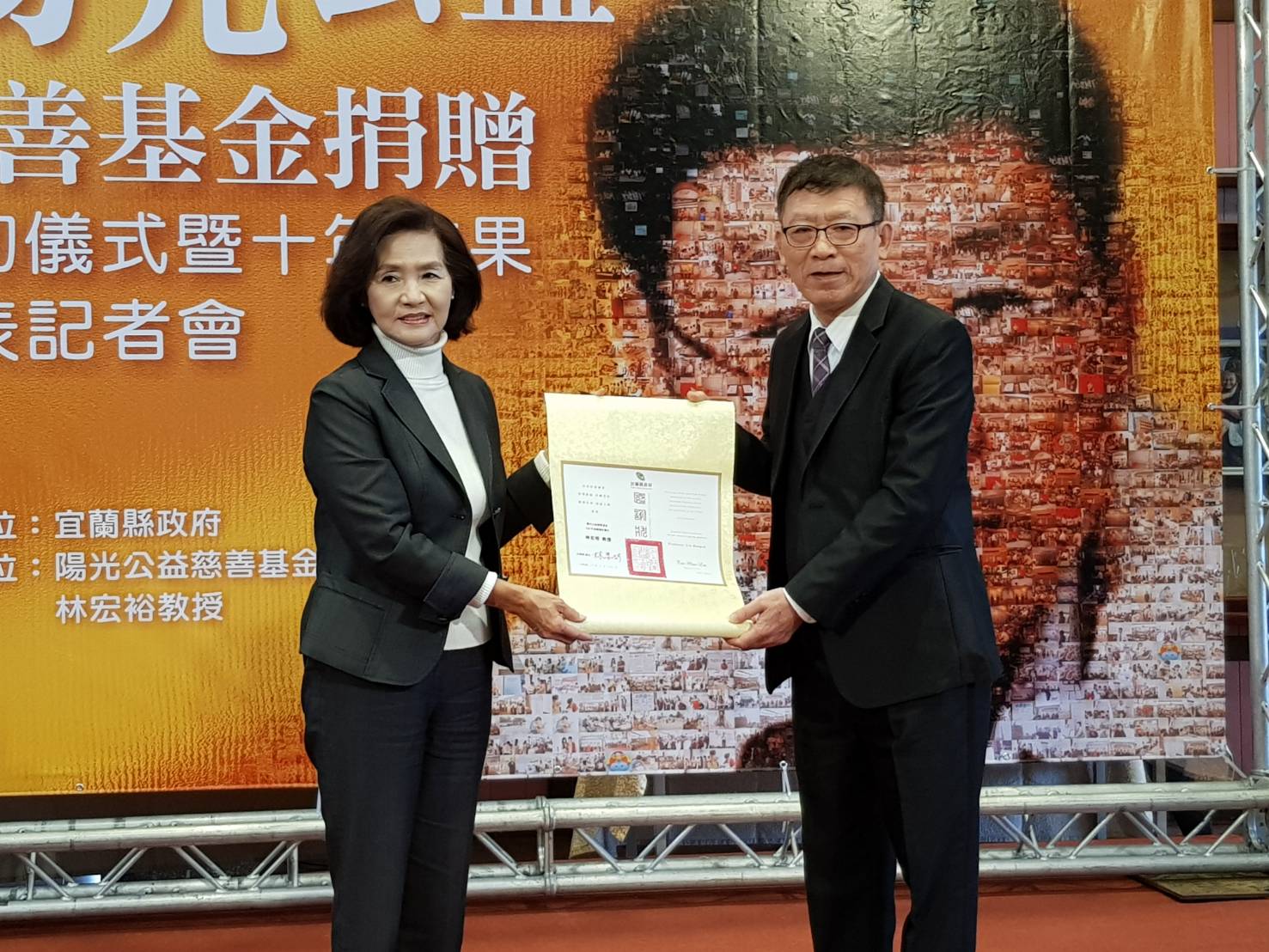 宜蘭縣長林姿妙致贈感謝狀給陽光公益慈善基金會林宏裕教授。(記者邱淑珍/攝影)