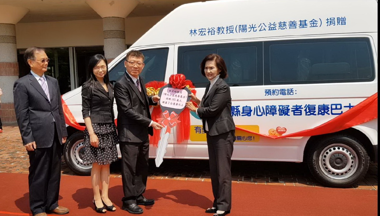 陽光公益慈善基金會林宏裕教授捐贈復康巴士鑰匙,由林姿妙縣長代表接受。(記者邱淑珍/攝影)