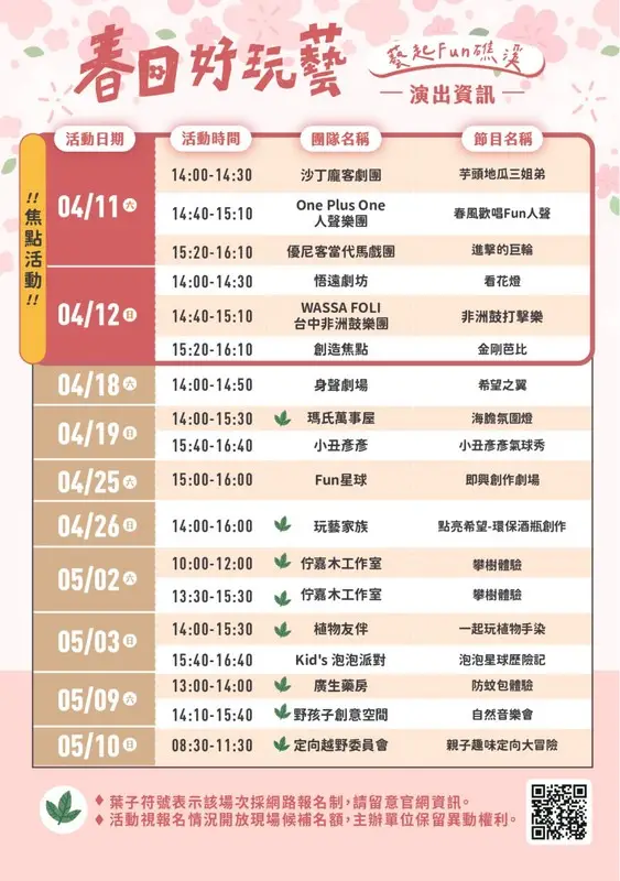 活動時間:115年4月11日至5月10日每週末。(詳參演出活動時間表)