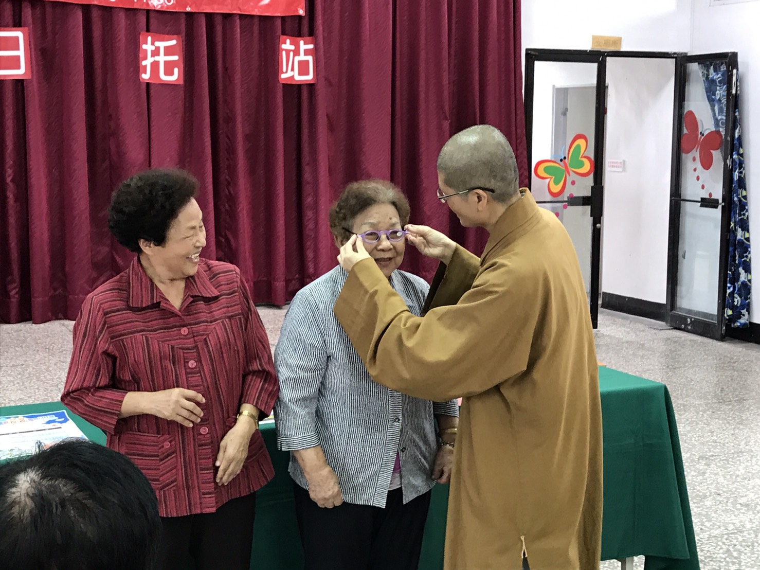 蘭陽仁愛之家執行長釋妙志法師親自幫銀髮長者戴上合適的老花眼鏡〈記者王名煒攝〉