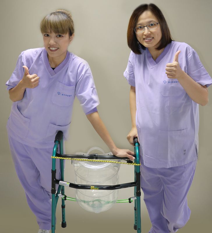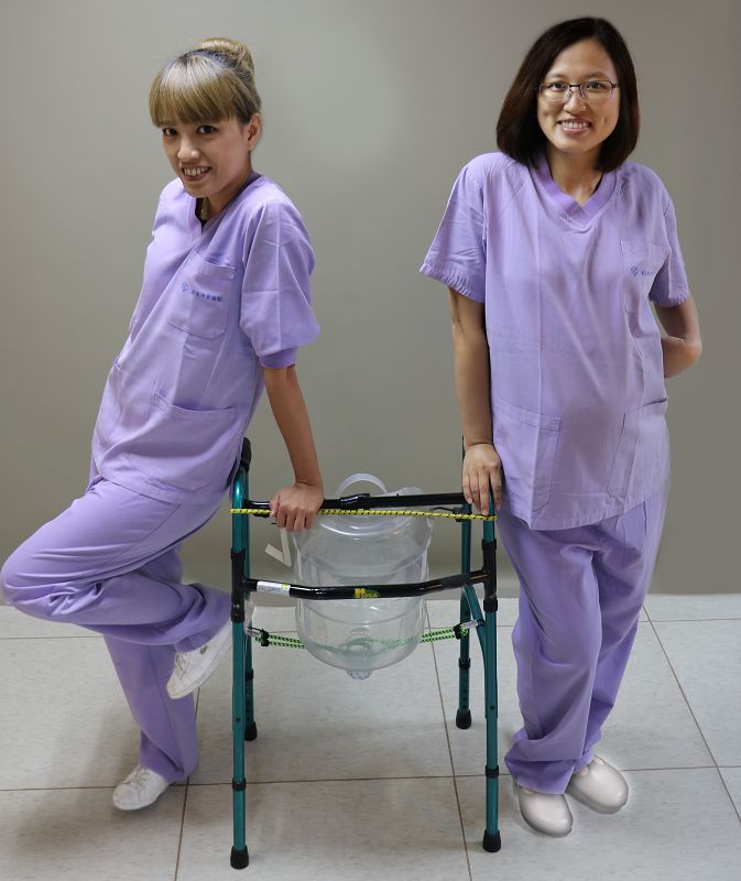 羅東博愛醫院急診室護理師江薏苓與石佳靈護多次組隊參加宜蘭縣護理師公會舉辦的「護理創新競賽」,這次2人再度組隊參賽,在眾多參賽者中脫穎而出,榮獲冠軍,江薏苓分享,當初創作「創新站立式小便斗」 是想改善男性病人下床至廁所小便的不便,減少跌倒的風險, 剛好家中小朋友有使用活動式小便斗,她以此發想,將塑膠桶與標準助行器結合後,設計出「噓不跌倒~創新站立式便斗 」。
