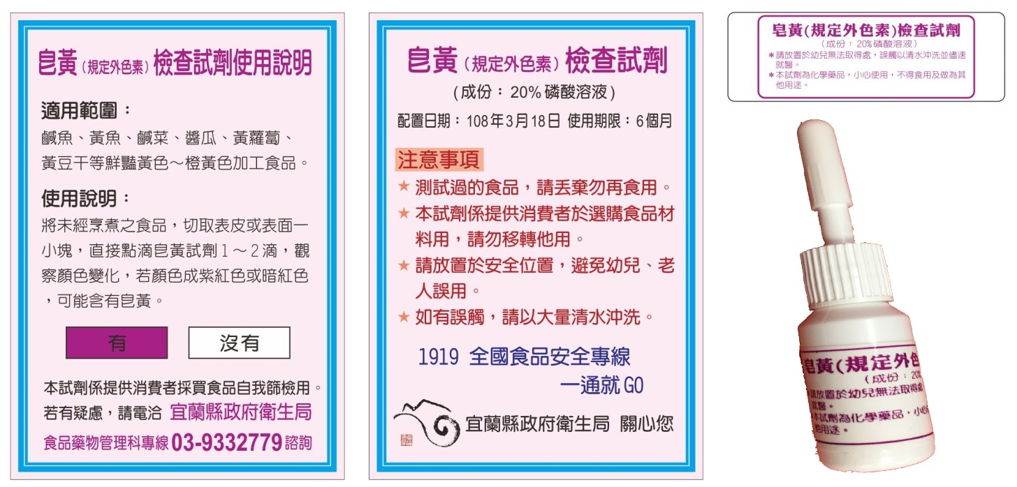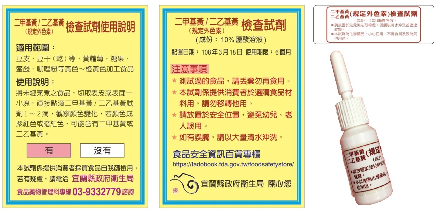 宜蘭縣衛生局局長徐迺維表示,即日起免費提供500份「食品簡易DIY篩檢試劑」,領取後請依照試劑使用說明指示操作及妥善保管,將試劑放置於安全位置,以避免幼童及長者誤用,倘若篩檢出疑似「有」不合格食品,請逕向衛生局食品藥物管理科提供購買來源資訊,經衛生局派員稽查及抽驗結果進一步確認違規事項,將依食品安全衛生管理法相關法令規定進行裁處。