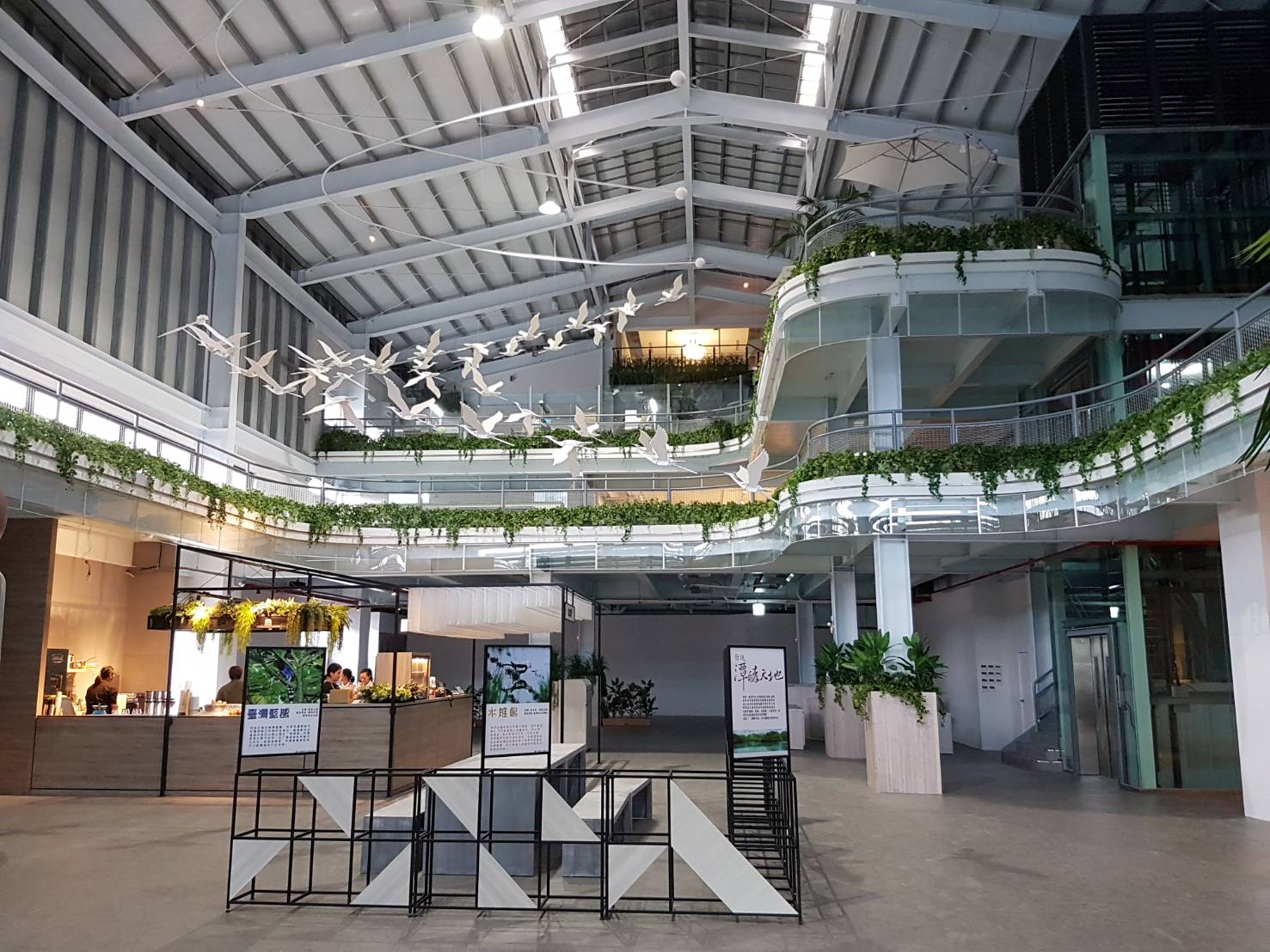 「潭酵天地」觀光工廠大廳裡悠遊翱翔的白鷺鷥及佈滿綠化植物。(記者邱淑珍攝)