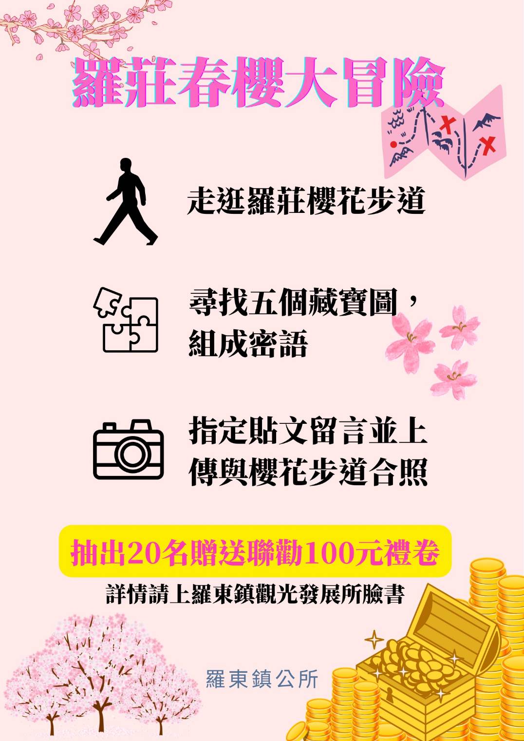 賞櫻不遠求,快來羅東限定秘境-羅莊櫻花步道賞櫻趣!這裡有平地最長的櫻花步道,河岸兩旁空曠怡人,適合舉家出遊漫步。羅東鎮公所更推出導覽解說服務,志工帶領民眾散心之餘,還能深入了解在地故事;不僅如此,羅東鎮觀光發展所臉書也有櫻花推廣活動,邀請民眾賞櫻抽好禮!各位朋友千萬別錯過!